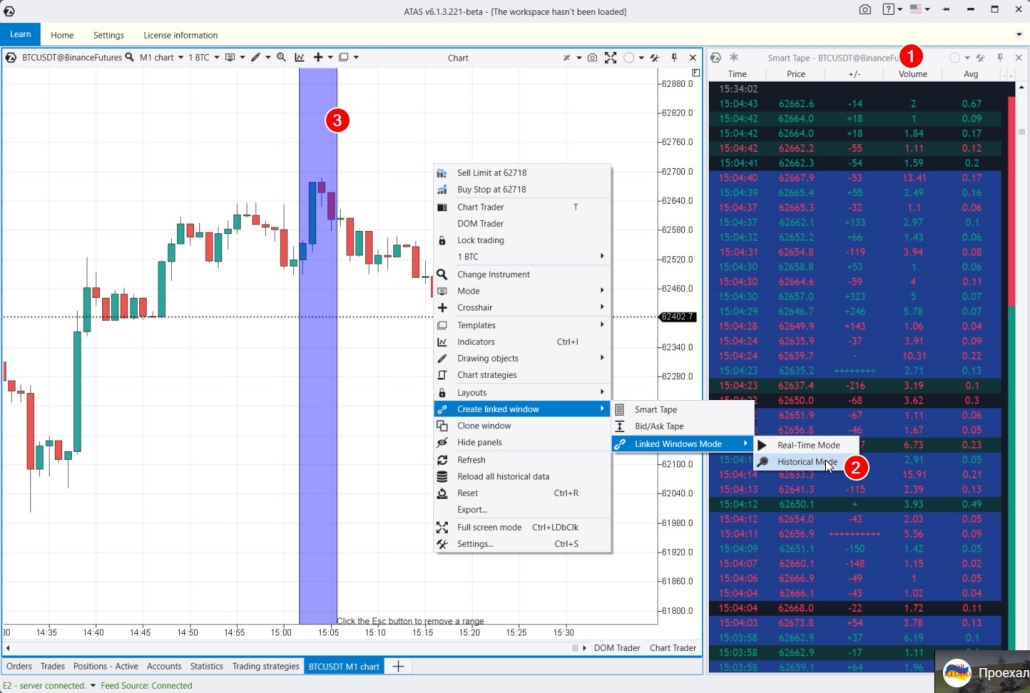 For instance, if you want to analyze a downward reversal in the Bitcoin futures market. Open the tape and select Historical Mode (2). The platform will activate a purple vertical capture area (3). Select the area of interest on the chart with your mouse, and ATAS will display the trades that occurred during those moments in the tape.