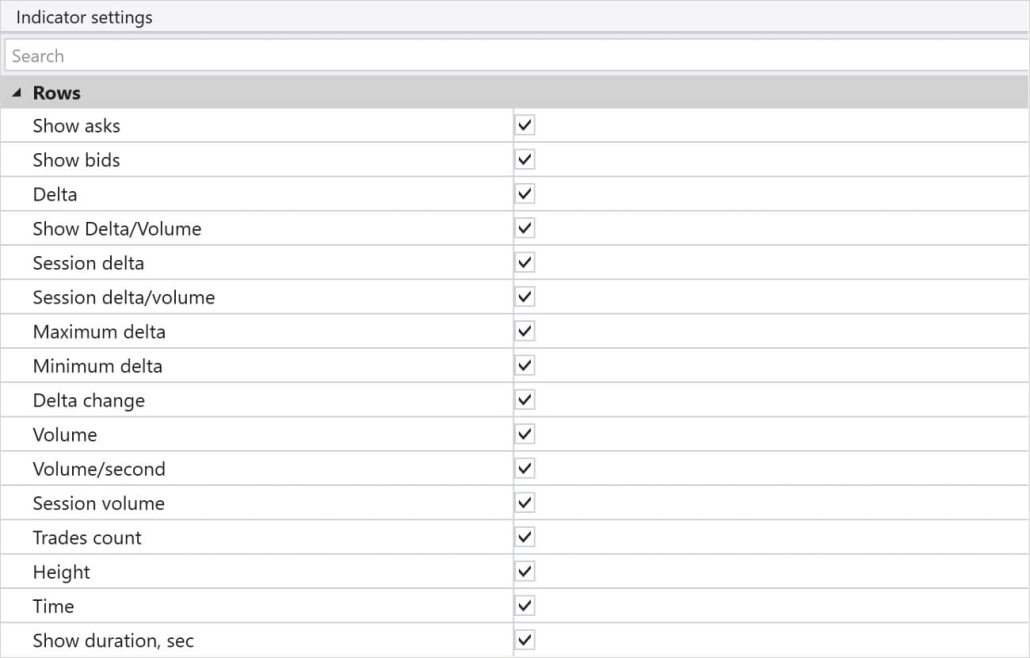 Visualization: You can choose which specific parameters to display on the chart, such as total volumes, delta, number of trades, and other key indicators.