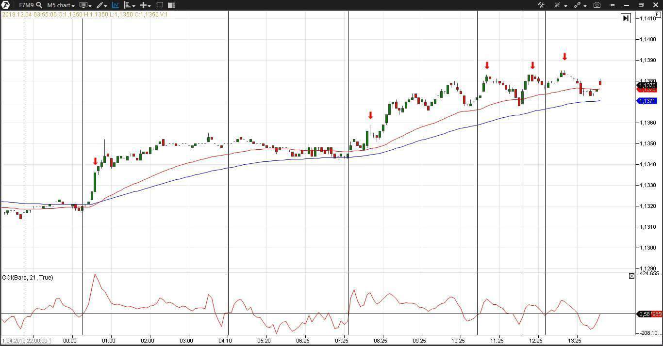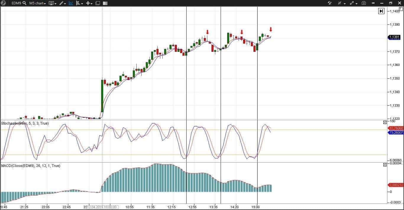 Let us implement this strategy in the 5-minute chart of a EUR/USD E-mini Euro futures (E7M9).
