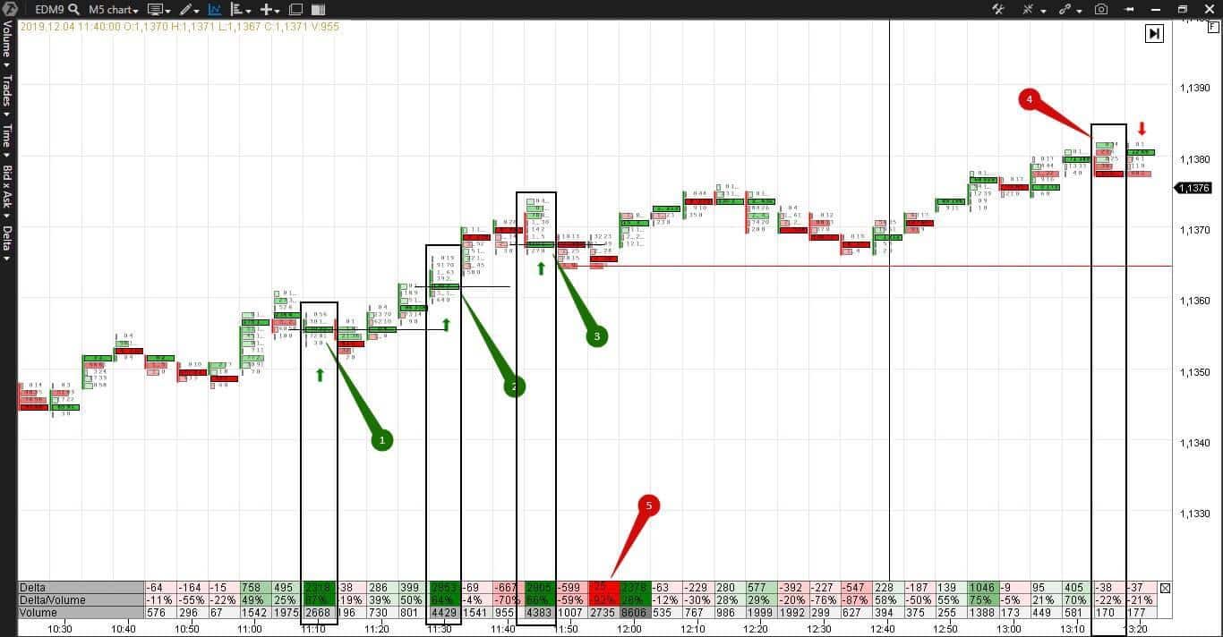 Number 5 marks aggressive sells, which failed to break the support level, marked with a red line. This level worked during the whole day and it could have been used as a barrier for setting stops.