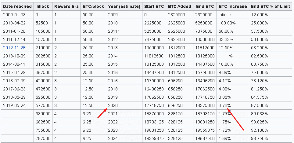 Limited bitcoin emission. Multi-trillion emission of fiat money in the US, EU, Japan and Great Britain hasn’t practically stopped after the 2008-2009 crisis. It undermines confidence in the currencies, which are subject to hidden devaluation. Bitcoin is deprived of this shortcoming since its emission is restricted by a computer algorithm. BTC 21 million will be issued during the whole time of its existence and 87% of them are already in circulation. You can see in the table below that the supply would increase only by 3.7% in 2020 and by 1.79% in 2021. This fact plus the growth of demand from long-term investors would maintain the price.