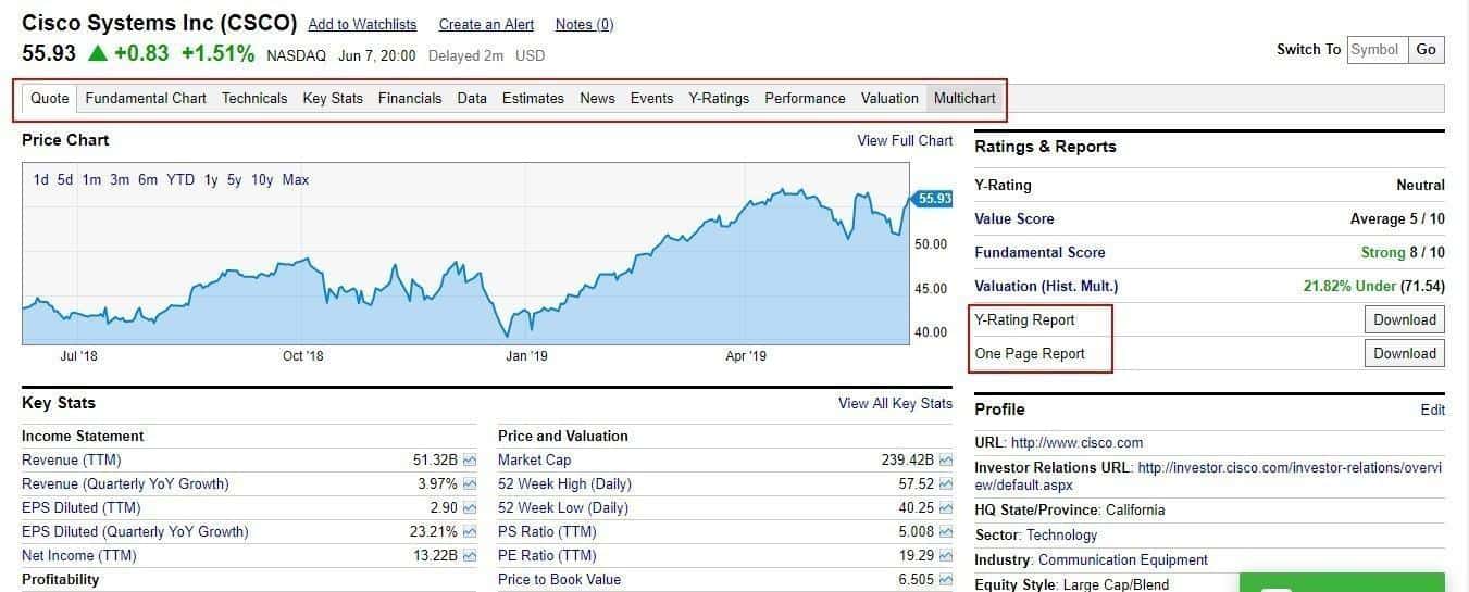 For example, a fundamental analysis of the Cisco company. We marked key data and reports, which an investor may download from the website, with red rectangles.