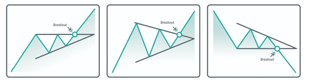 - Symmetrical triangle. The point of entry into buys along a trend is marked with an arrow.