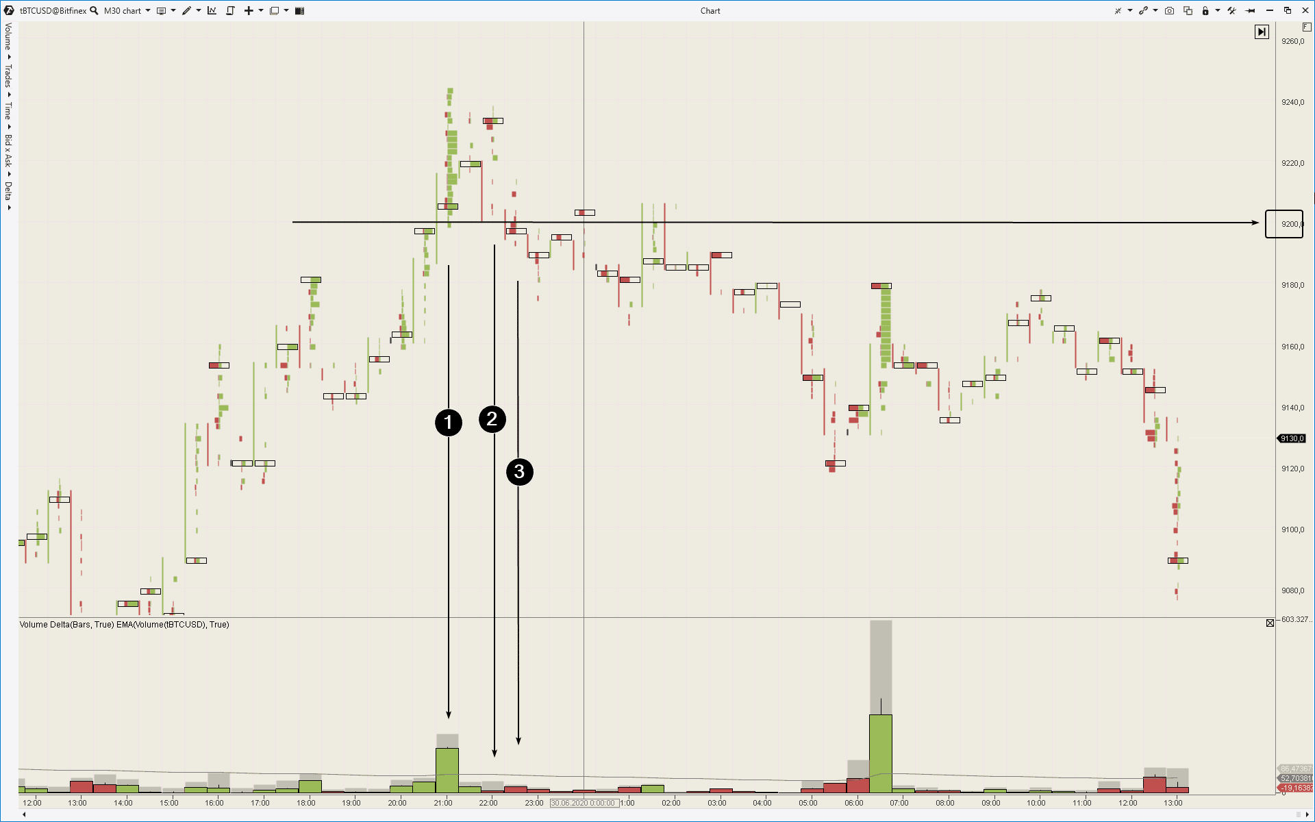 - However, the price goes back to 9200 in the next bar. Besides, it takes place with a small domination of sellers (we can see it from the red delta).