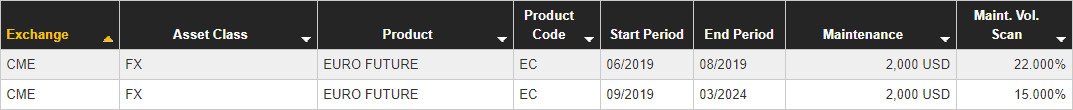 Gehen Sie als Nächstes zum Abschnitt Margins, der Informationen über die Mindestgarantieverpflichtung (GV) für einen Kontrakt auf das 6E-Instrument enthält. In unserem Fall beträgt der GV 2000 USD pro Kontrakt für über Nacht getragene Positionen.