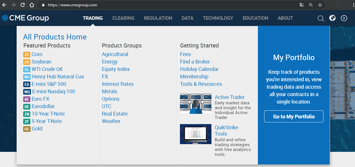 In Bezug auf die CME-Börse werden für jedes Instrument Margin-Anforderungen festgelegt, die auf der Website www.cmegroup.com aufgeführt sind. Wählen Sie im Abschnitt „Trading“ des Hauptmenüs eine Gruppe von Instrumenten aus der Liste aus.
