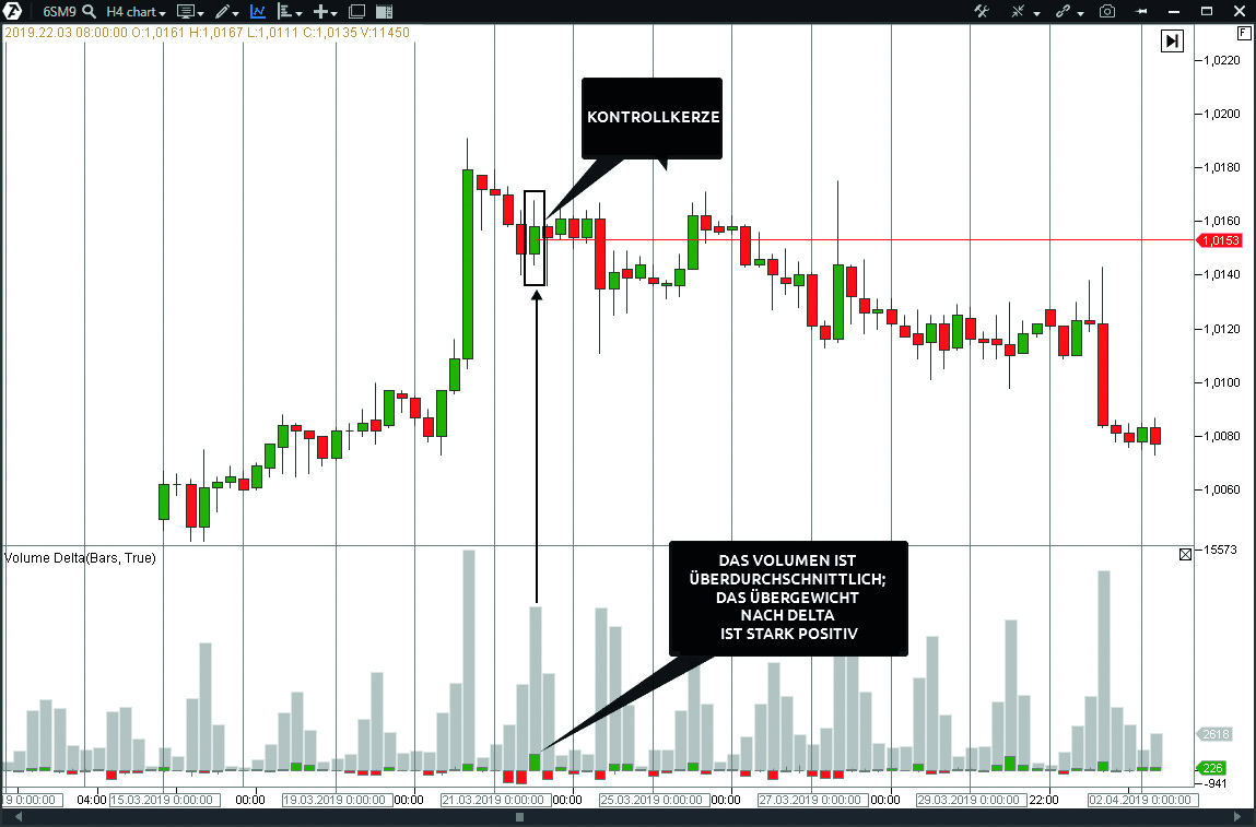 Wir finden bei der Aufwärtsbewegung des 6S-Instruments (Schweizer Franken Futures) eine Kerze mit einem Volumen über dem Durchschnitt und einer maximalen Marge im Delta. Wir markieren diese Kerze als Kontrollkerze.