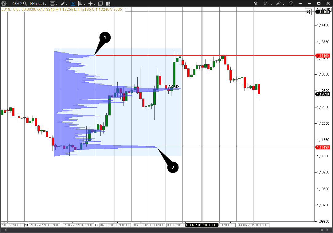 Eine andere Möglichkeit, Margin-Zonen aufzubauen, besteht darin, den Ebenen großer horizontaler Volumina einen Referenzpunkt zuzuweisen, der die Aktivität (das Interesse) der Marktteilnehmer widerspiegelt. Um die horizontale Konzentration der Volumina zu bestimmen, müssen Sie das Marktprofil-Zeicheninstrument zum Chart hinzufügen (drücken Sie einfach F3, um es aufzurufen).