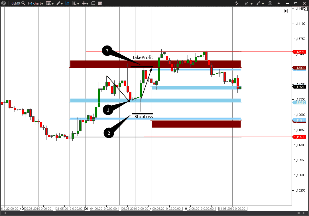 An Punkt #1 wird die obere Margin-Ebene berührt, ab der ein Verkauf eröffnet werden soll. Der Take-Profit wird bei Punkt #2 auf die Hälfte der Margin-Zone festgelegt.