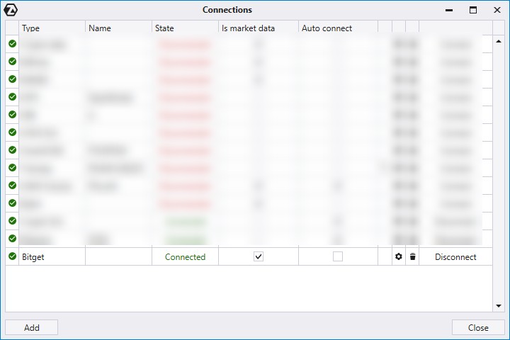 Schritt vier. Klicken Sie in der ATAS-Plattform auf Verbindungen, dann auf Add (1), wählen Sie Crypto → Bitget.