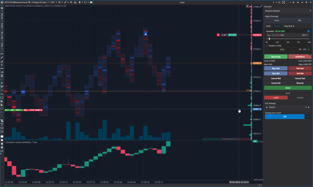 Grafische Werkzeuge für erweiterte Analysen: Verankerter VWAP, Dynamischer POC, CVD-Korrelation, Marktprofil und TPO, Long/Short-Position.