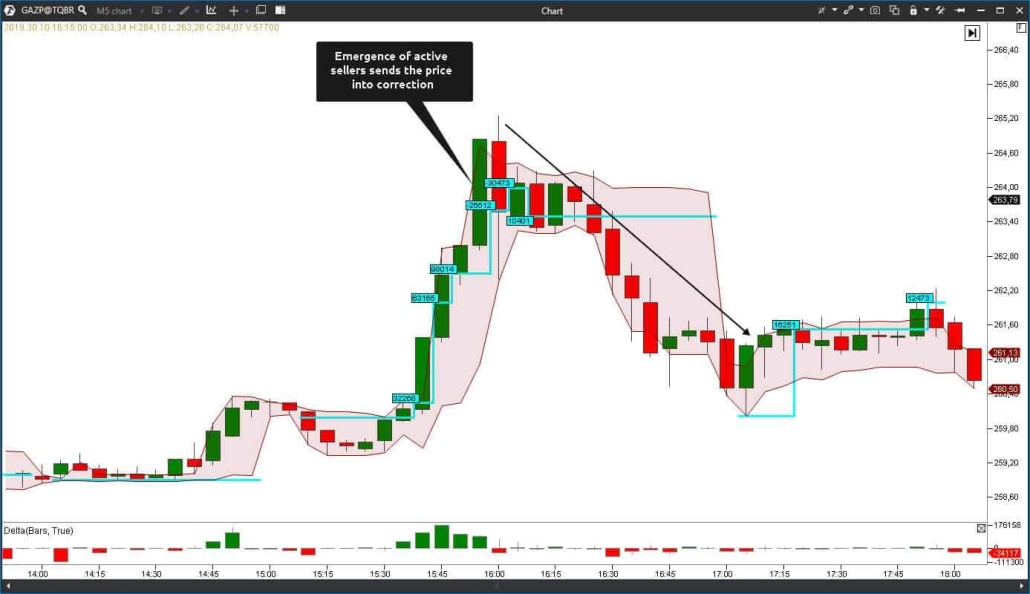 Die Einstellungen des Dynamic Levels Indikators ermöglichen es Ihnen, ihn für verschiedene praktische Aufgaben zu verwenden. Betrachten wir einige davon: – Verfolgung der Migration mit hohem Volumen; – Suche nach der Dominanz von Verkäufern oder Käufern. Wenn sich der Preis in der „fairen Zone“ befindet (wo Angebot und Nachfrage sich ausgleichen), sehen wir ein erhöhtes Handelsvolumen. Dies liegt daran, dass der Preis sowohl für Käufer als auch für Verkäufer akzeptabel ist. Aber früher oder später verlässt der Preis unter dem Einfluss von Nachrichten oder anderen Faktoren, die auf den Markt kommen, die faire Balance Zone auf der Suche nach dem nächsten. Am Beispiel der Aktien von PJSC Gazprom betrachten wir, wie das Volumen im Laufe des Tages migriert wurde.