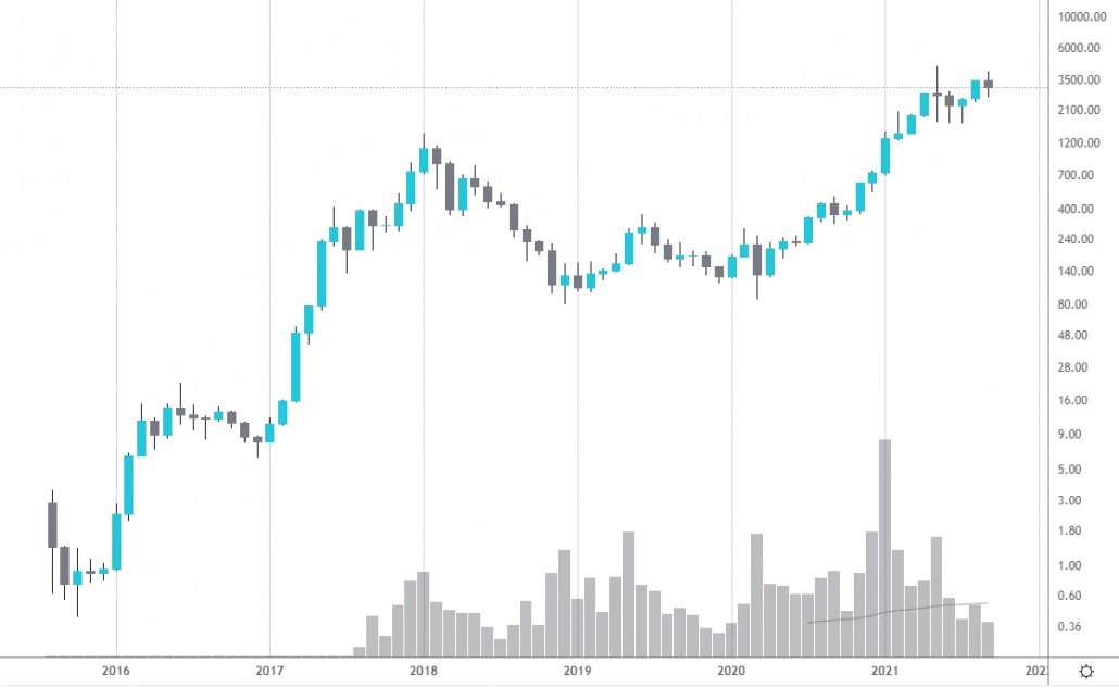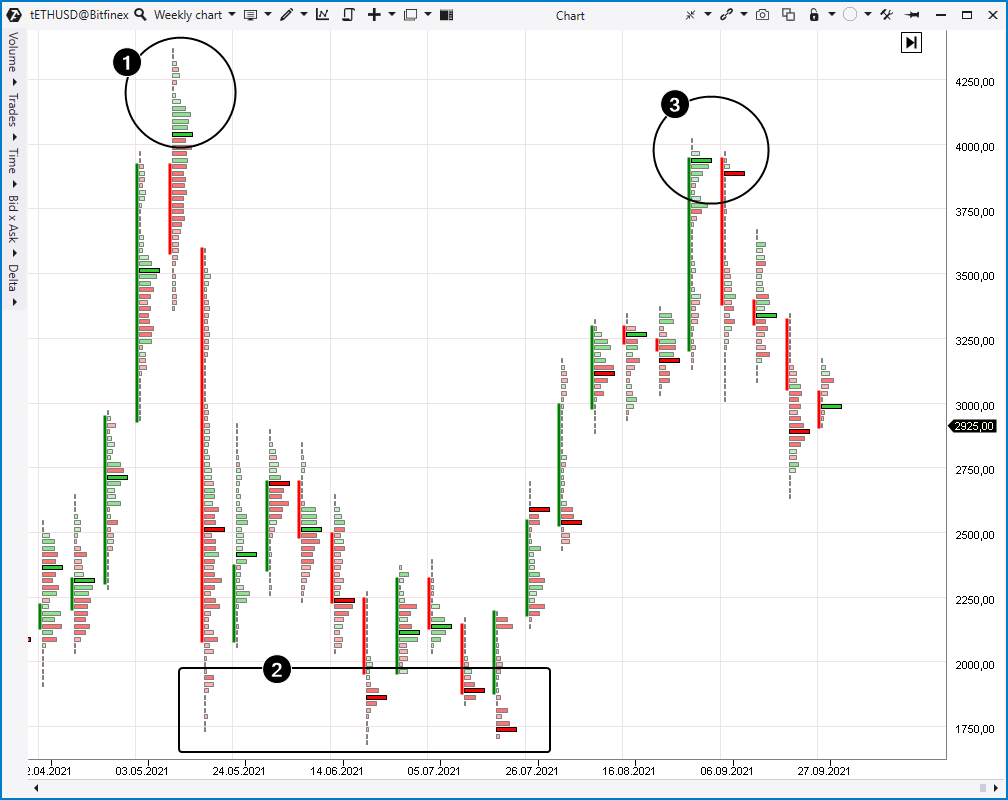 Im September 2021 veröffentlichten Analysten von Standard Chartered eine Prognose mit einem Kursziel von 26.000 bis 35.000 Dollar pro Ether. Die Bank erwartet, dass Ethereum Bitcoin letztendlich in der Kapitalisierung übertrifft. Forbes schrieb, dass große Investoren Ether aufgrund der anhaltenden Begeisterung für nicht fungible Token (NFT) und der Erwartungen, dass die dezentrale Finanzierung auf Ethereum-Basis (DeFi) mit der traditionellen Finanzierung konkurrieren wird, bevorzugen. Andere Schätzungen sind weniger optimistisch. Nikolaos Panigirtzoglu, Kryptowährungsstratege bei JPMorgan, schätzt den fairen Wert von Ether basierend auf der Netzwerkaktivität auf rund 1.500 US-Dollar. Laut dem Experten ist das Ethereum Netzwerk aufgrund des aktuellen Ether Preises und der wachsenden Konkurrenz durch Blockchains wie Solana und Cardano weniger attraktiv. Zum Zeitpunkt des Schreibens im September 2021 bewegt sich ETHUSD um die 3.000 US Dollar. Und die Range von 1500 Dollar (-50%) bis 35000 Dollar (+ 1100%) ist offensichtlich zu groß. Dies spiegelt den Mangel an Ether als Anlagevermögen wider, beispielsweise seine Volatilität. Daher ist es für einen normalen Anleger wichtig, sich eine eigene Meinung über einen sich dynamisch verändernden Markt zu bilden. Dabei hilft die Handels- und Analyseplattform ATAS (kostenloser Download) mit direkten Anbindungen an Kryptowährungsbörsen. Mit der Plattform kann man Cluster Charts erstellen, die das Verhalten von Käufern und Verkäufern klar darstellen. Ein Beispiel ist unten.