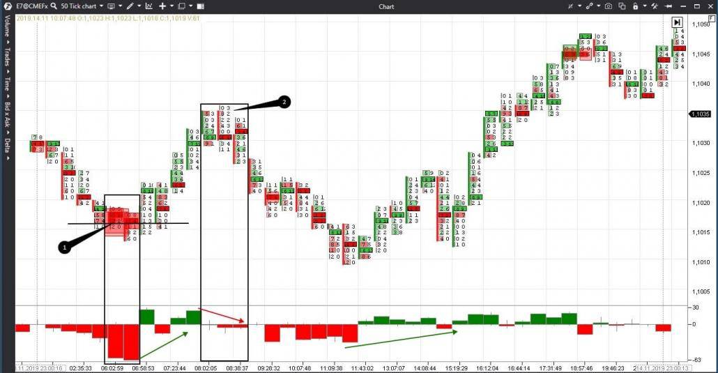 Sehen wir uns an, wie der Footprint mit dem Delta auf einem 50-Tick-E-Mini-Euro-Futures-Chart zusammenarbeitet.