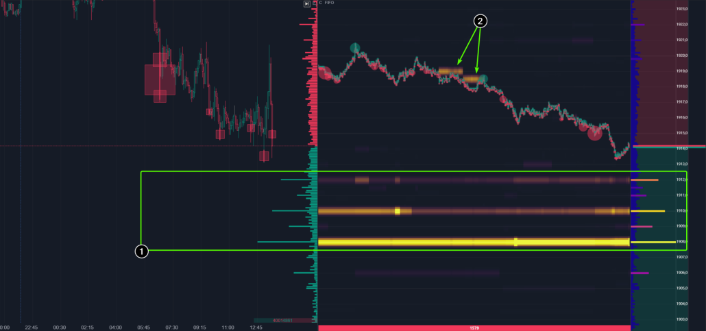 Der folgende 5-Minuten-Chart zeigt die Situation auf dem Intraday-Markt. Der Chart wurde mit einem Big Trades-Indikator und einem DOM Trader-Modul mit Heatmap vervollständigt.
