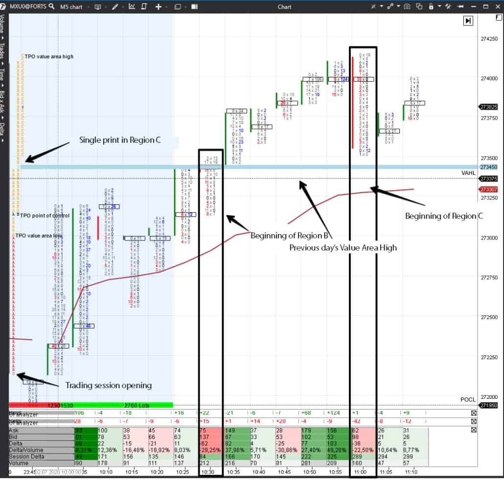 Singleprints zeigen Preisbeschleunigungslevels. Sie könnten auch verlängert werden, bis sie das Chart berühren. Singleprints sind im obigen Beispiel grau markiert. Singleprints zeigen die Stärke und Aggression einer Seite. Diese Levels sind auch Widerstands- und Unterstützungsbereiche. Solange die Singleprints nicht „gelöscht“ werden, können wir davon ausgehen, dass sich die Korrelation der Marktkräfte nicht geändert hat. Betrachten wir ein Beispiel auf einem 5-Minuten-Chart der Futures auf den Moskauer Börsenindex.