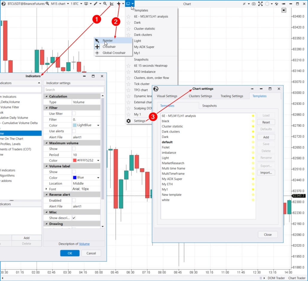 Die nächste Funktion im Menü ist der Indikatormanager (1). Mit ihm können Sie Indikatoren auf Ihrem Chart hinzufügen, konfigurieren oder entfernen. ATAS bietet über 400 Indikatoren, und diese Liste wird ständig erweitert.