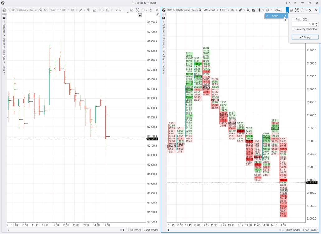ATAS kann automatisch die optimale Skala basierend auf den Marktbedingungen wählen, wenn Sie das Kontrollkästchen Auto aktivieren. Sie haben auch die Möglichkeit, den Auto-Modus manuell zu deaktivieren und die Skala nach Ihren Wünschen einzustellen, was besonders bei volatilen Instrumenten oder größeren Zeitrahmen nützlich ist.