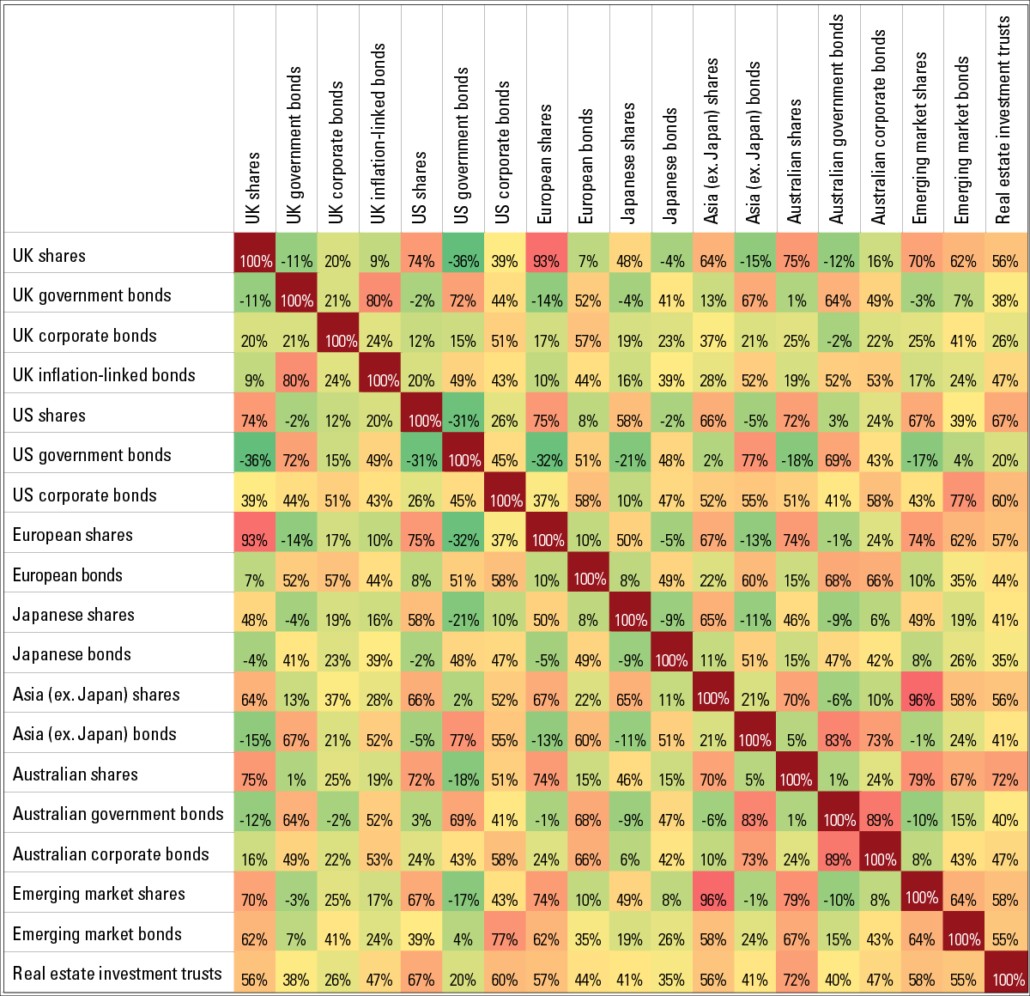 Nachfolgend finden Sie ein Beispiel der Korrelationsmatrix von Vermögenswerten in verschiedenen Ländern, die von der Investmentgesellschaft Vanguard im Jahr 2020 entwickelt wurde.