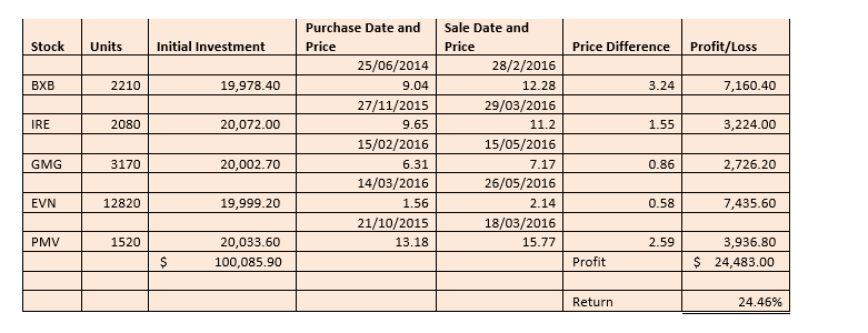 Der Anleger kaufte die Aktien für eine durchschnittliche Laufzeit (Haltedauer ca. 1,5 Jahre) und erhielt einen „Blowout“ von 24,46%.