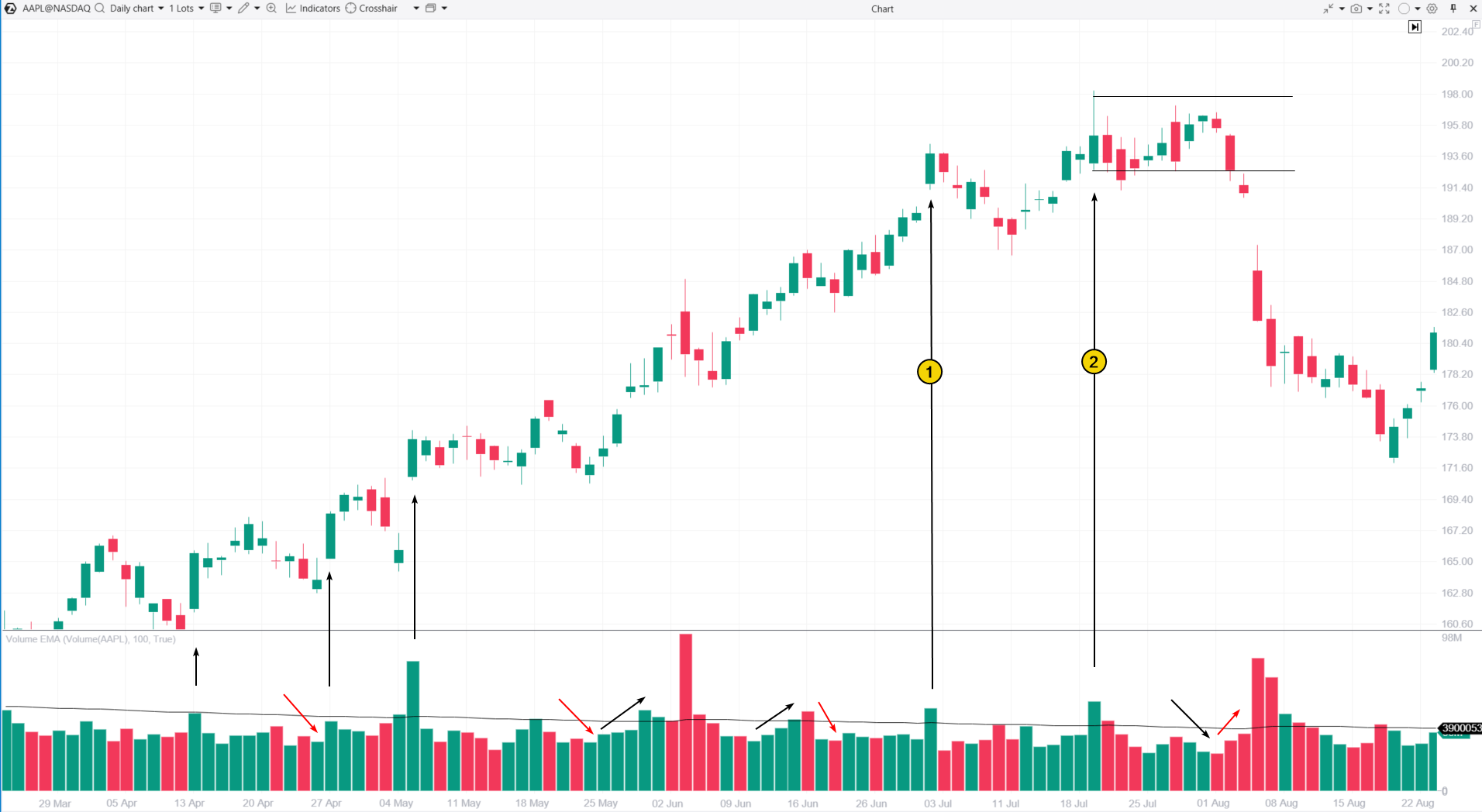 (1) Der Kurs brach unter die Unterstützung bei $180 und fiel mit großen bärischen Gaps und überdurchschnittlichem Volumen zurück. Um dort Panikverkäufe (Selling Climax, SC) zu erkennen, sollte das Volumen idealerweise auf das 2-3fache des Durchschnittsniveaus angestiegen sein. Bei einer hochkarätigen Aktie wie AAPL kann es jedoch zu Ausnahmen kommen.