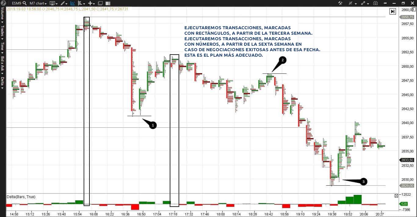 - Conexión de futuros para el índice S&P mini, configuración del time frame de 7 minutos, configuración de negociaciones: «cambio del delta en niveles significativos del día», esta es la tarea para las semanas 1-9