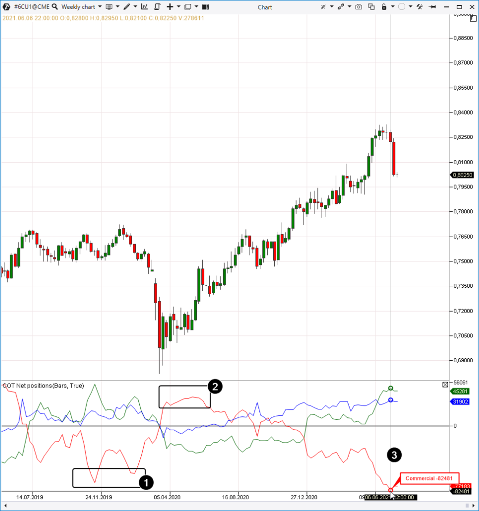 Los indicadores, que se basan en los informes «Compromiso de los comerciantes» (informes COT), muestran las posiciones de varios grupos de traders en dinámica. Es una herramienta muy útil para la negociación de divisas, materias primas e índices bursátiles a mediano plazo.