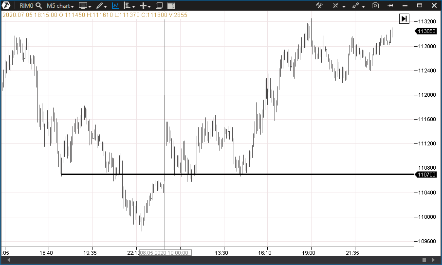 En el siguiente ejemplo, mostraremos que el precio a veces puede romper la zona de equilibrio por un corto periodo. Este ejemplo se toma para futuros del índice RTS.