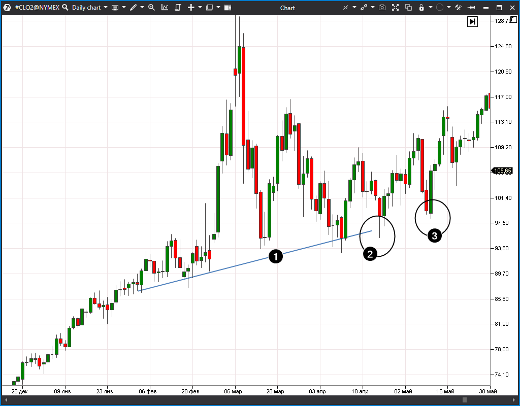 El siguiente gráfico muestra la dinámica del trading de futuros del petróleo en un marco temporal diario. Esta es la escala en la que se pueden encontrar soportes más fuertes para negociar rebotes y mantener posiciones más allá de unas pocas horas. La línea de tendencia (1) que apoya la subida del petróleo puede trazarse contra los mínimos de febrero-abril. Cuando el precio vuelva a caer hacia esta línea, el prerrequisito es cambiar al marco de tiempo intradía y explorar una entrada de rebote desde la línea de tendencia alrededor del nivel de $97 por contrato.