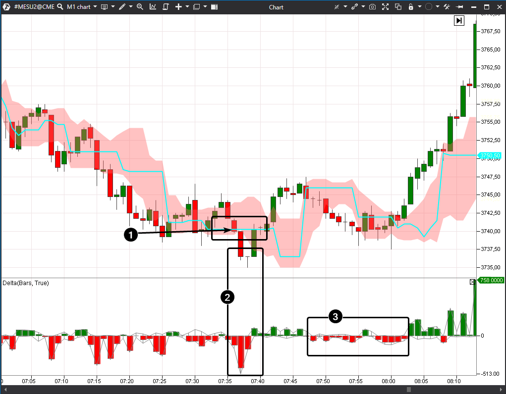 - Sin embargo, si adopta el segundo enfoque, necesitará confirmación. El primero es probablemente el indicador delta (lo hemos ampliado para que pueda verlo mejor). El indicador muestra un cambio brusco de un delta positivo a un delta negativo (3). El precio actúa en consecuencia, disminuyendo desde la apertura hasta el cierre. Esta ligera activación vendedora fue el inicio de una nueva oleada, haciendo caer el precio de ETH hasta 1660 el mismo día.