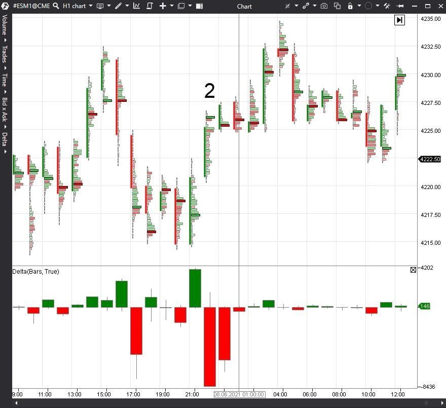 En el punto 1, vemos un clúster extremo resaltado con un color intenso. En el indicador «Delta» en esta vela se encuentra un Delta negativo grande, pero después de eso el precio no bajó más. Tal vez el movimiento fue detenido por un comprador límite que se activó en la parte inferior de la vela.
