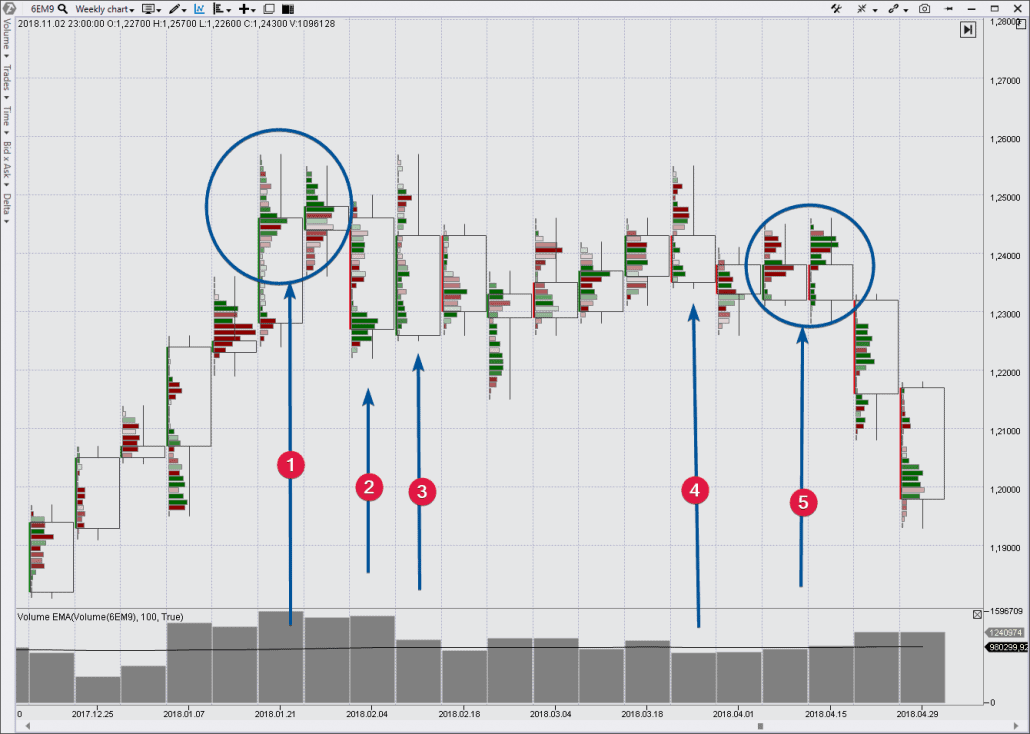 Prenons le marché EURUSD, qui est très populaire parmi les traders Forex. Nous utilisons la période hebdomadaire, le type de cluster Delta Colored Trades Histogram et les données du marché à terme.