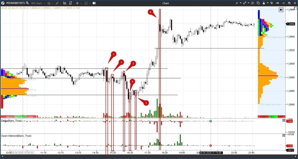 Voyons à quoi ressemblaient les cassures et les points extrêmes locaux dans le graphique Empreinte. Nous avons marqué des bougies intéressantes avec des rectangles rouges et des chiffres. Voir l’image 3.