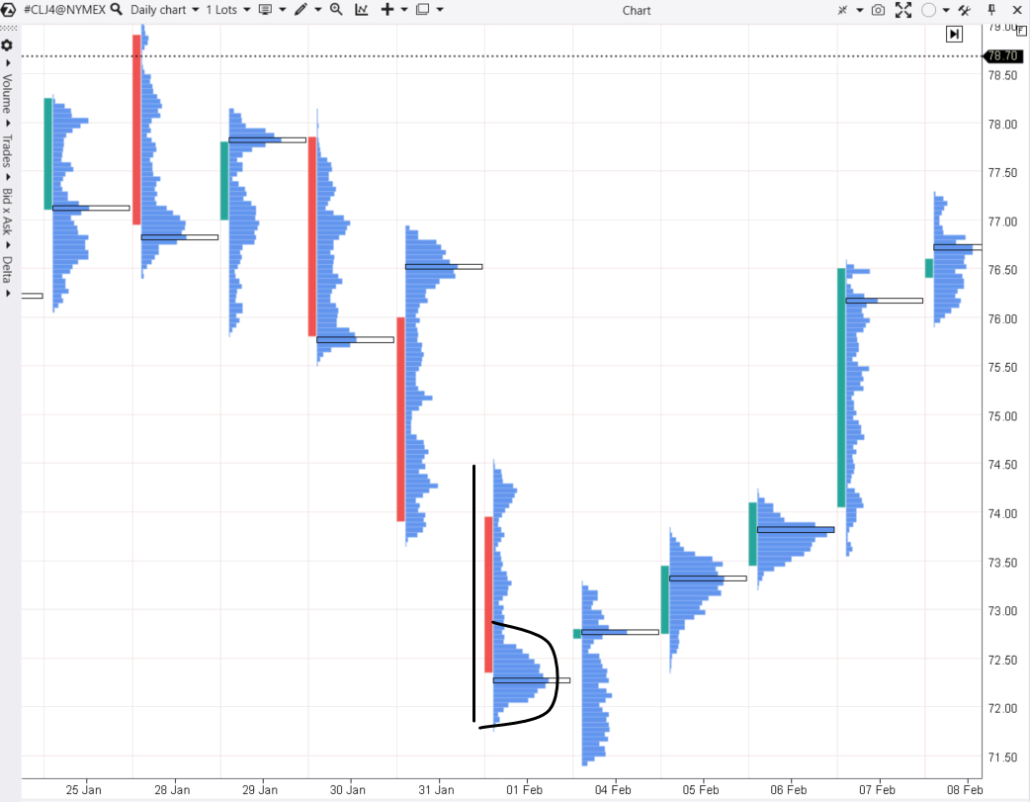 Le 1er février, un modèle similaire à la lettre « b » s’est formé, avec des baisses de prix qui se sont produites auparavant. Cela signifie qu’un acheteur conditionnel est apparu sur le marché : soit les « shortistes » ont fixé leurs profits, soit les « longistes » ont ouvert des ordres à cours limité (« J’achète tout ce qui se trouve en dessous de 72,50 ») – et plus probablement les deux.