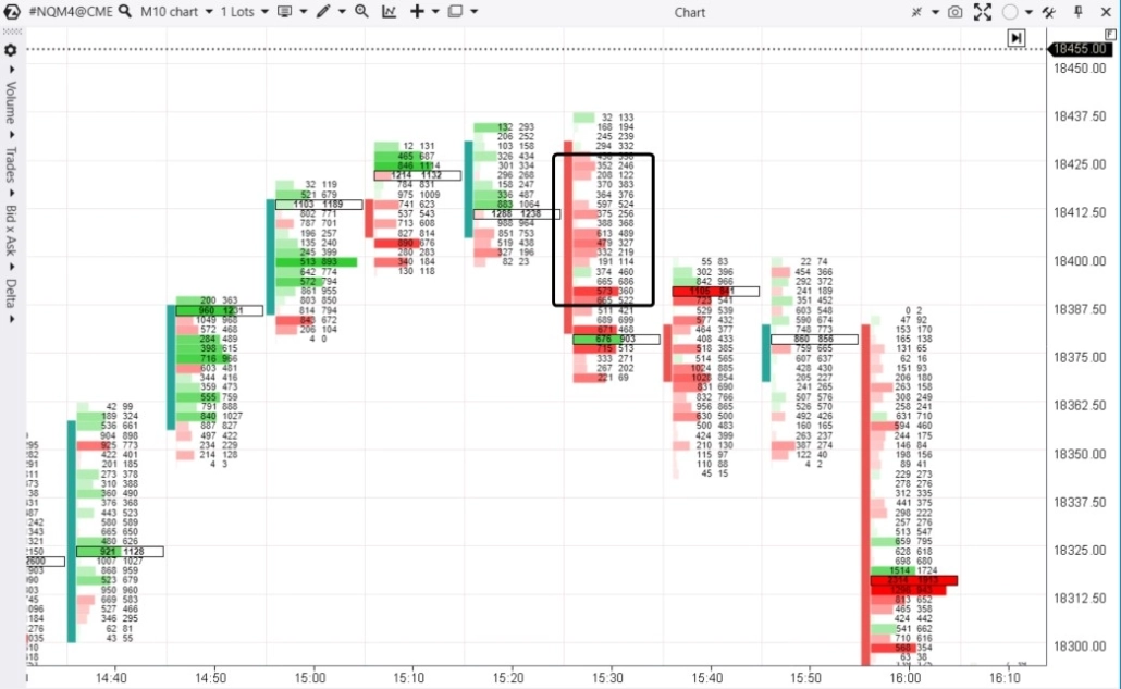 Exemple de retournement baissier du marché E-mini des contrats à terme sur l’indice Nasdaq, période de 10 minutes :