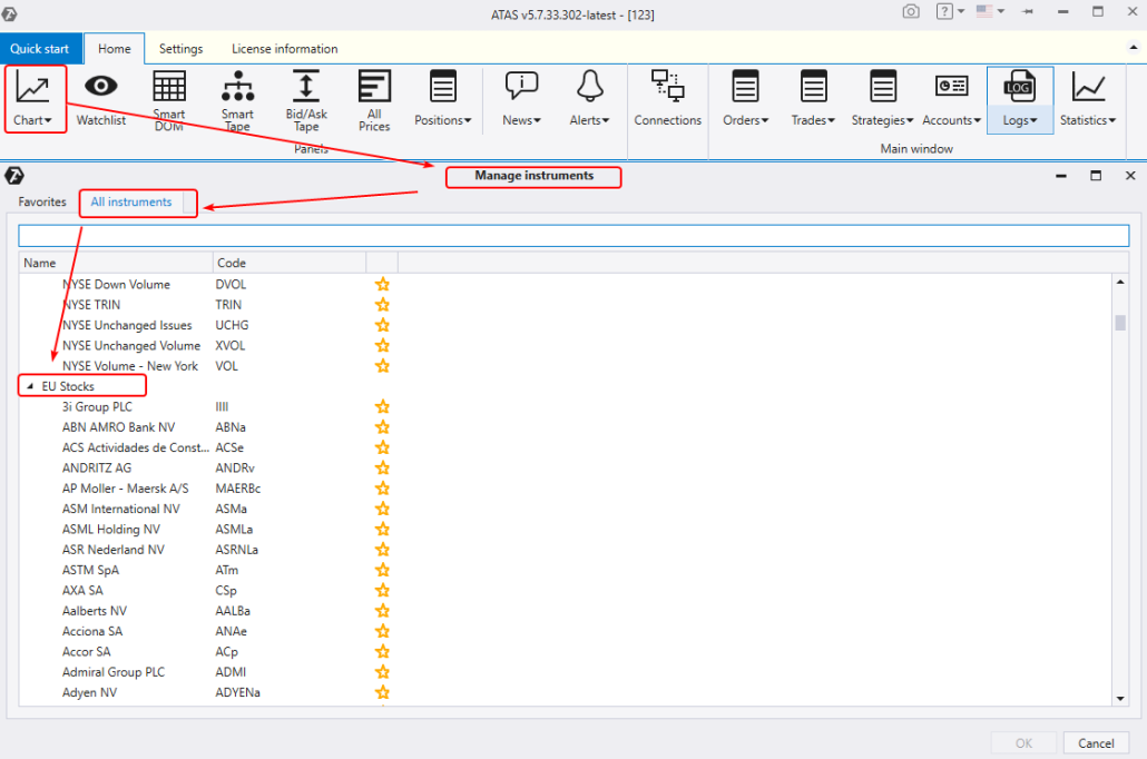 Téléchargez gratuitement la plateforme ATAS, installez-la et exécutez-la. Ouvrez ensuite le Graphique et, dans la fenêtre du Gestionnaire d’outils, dans l’onglet Tous les outils, sélectionnez la section Actions UE. Vous sûrement trouverez ici toutes les actions qui sont incluses dans l’indice DAX.
