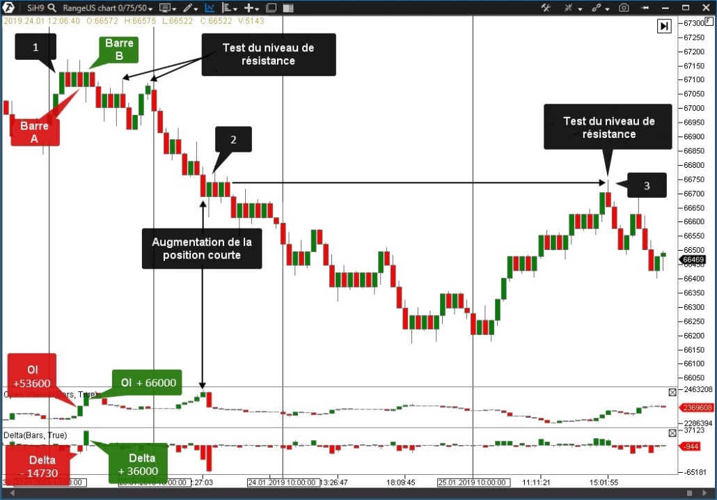 Ci-dessous se trouve le graphique de l’instrument SiH9. Cet exemple montre la méthodologie de recherche d’un acteur majeur qui influencera le prix des contrats à terme. Le graphique RangeUS a de tels paramètres : Trend – 75, Reversal – 50, les indicateurs Open Interest et Delta y sont ajoutés, la période considérée est 22-25 janvier 2019.