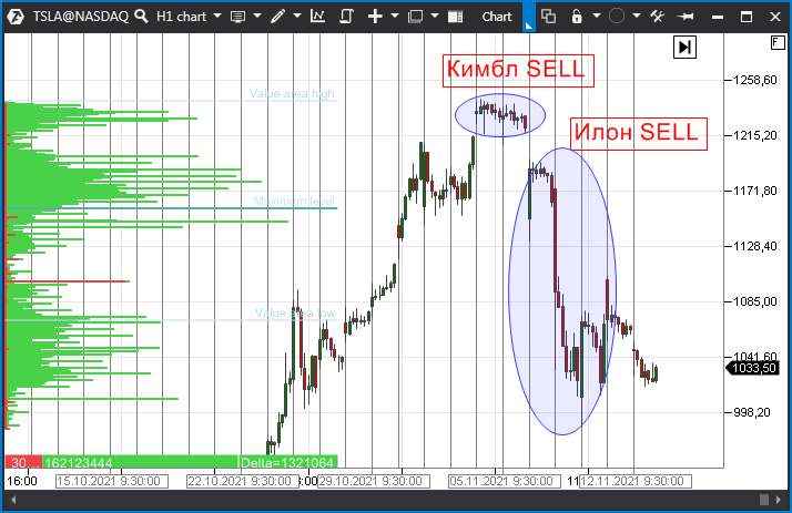 Вопрос: заработали ли на этом «медведи былых времен»? Боюсь, что нет. Более того, нужно понимать: чем меньше открыто шорт позиций по бумаге, тем больше у нее шанс упасть. Впрочем, могло ли быть иначе после того, как Маск объявил о продаже 10% пакета акций? И самой оригинальной из всех идей, что мы наблюдали за последнее время, была просьба о помощи зала? Зал посоветовал продать. Бумага упала. Кто во всем виноват? Уж точно не Маск! Все претензии к «залу». Однако есть во всей этой истории один миленький нюанс. Брат Илона Маска продал акции Tesla более чем на $100 млн. Если точнее, всего он реализовал 88 500 акций по средней цене $1229,91 за бумагу. Таким образом, Кимбал Маск выручил $109 млн. Проданные акции составляли примерно 15% его пакета без учета опциона, который он реализовал прямо перед сделкой. Впрочем, что такое какие-то жалкие $100 млн при капитализации компании на тот момент в размере $1,1 трлн? Но волнует другой вопрос: можно ли рассматривать данные действия Маска как нарушение «этических норм»? Впрочем, о чем это мы? Ведь даже руководители ФРС нам показывают – не до «норм» сегодня. Кого они волнуют, когда речь идет о серьезных деньгах?