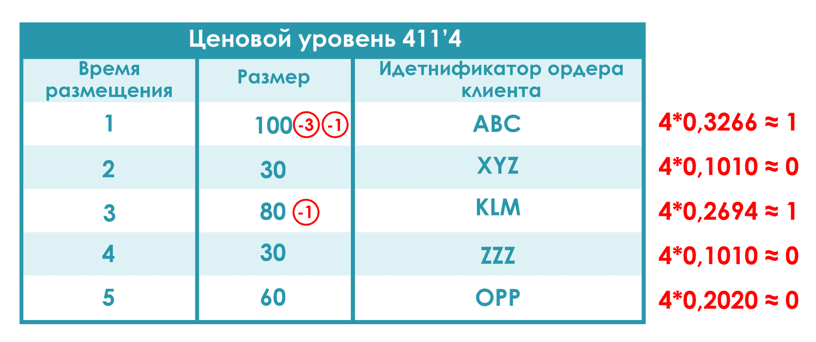 На втором этапе остальные 60% агрессивного ордера, то есть 4 контракта, будут исполнены по алгоритму Pro Rata. Ордера, находящиеся в стакане заявок, исполняются в соответствии с их размером и временем их размещения в стакане (вспоминайте логику работы алгоритма Pro Rata, мы ее описывали в первой части нашего цикла статей). Фактически мы находим, какой процент от общего размера всех заявок на уровне 411’4 составляет каждый из лимитных ордеров. Общий размер всех заявок на уровне лучшей цены после первого этапа аллокации: 97+30+80+30+60 = 297. Теперь вычисляем Pro Rata коэффициенты: