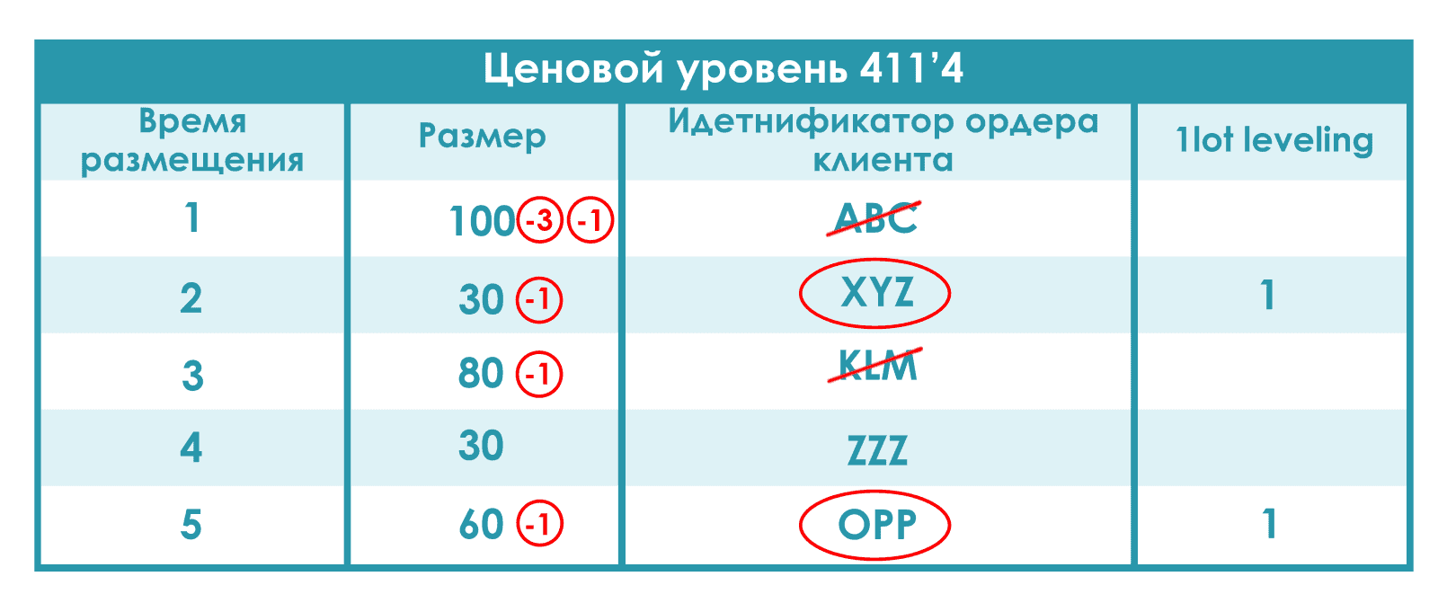 Любое остаточное количество агрессивного ордера исполняется по принципу однолотового равномерного распределения (англ., 1-lot leveling). В нашем случае, после действия алгоритма Pro Rata, осталось всего 2 контракта. Порядок исполнения лимитных ордеров определяется их размером и временем размещения в стакане заявок. Лимитные ордера, участвовавшие в аллокации по алгоритму Pro Rata (ABC и KLM), не участвуют в данном этапе. Итак, остается 3 ордера — XYZ на 30 контрактов, ZZZ на 30 контрактов и OPP на 60 контрактов. OPP самый большой по размеру ордер. XYZ и ZZZ -ордера одинакового размера, но первым в стакане заявок был размещен XYZ. Соответственно лимитники OPP и XYZ будут исполнены в размере одного лота каждый.