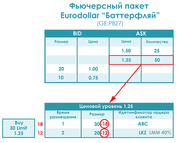 Давайте рассмотрим пример с фьючерсным пакетом Eurodollar “Баттерфляй” (англ. Eurodollar Futures Pack Butterfly). При сведении ордеров на данном рынке используется алгоритм FIFO c LMM (FIFO with LMM).
