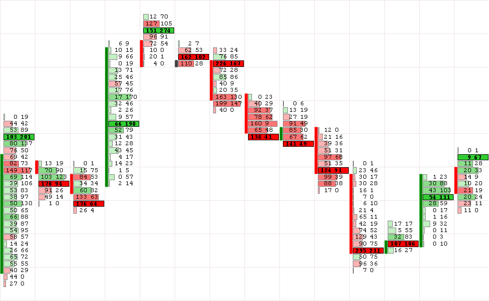 Каждый кластер окрашен в один из двух цветов, согласно настройкам (по умолчанию, красный и зеленый). Красный означает более агрессивные продажи по этой цене, зеленый, соответственно, более агрессивные покупки. Каждый кластер закрашен согласно перевесу продаж или покупок по конкретной цене и основывается на Дельте (Bid — Ask). Интенсивность окраски пропорционально зависит от степени перевеса покупателей над продавцами или наоборот. Трейдеры, приобретая опыт использования графика Футпринт, находятся в большей гармонии с основами динамики рынка и изменениями рыночной активности.