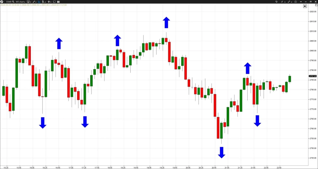 Стрелками на графике показаны фракталы, которые являются экстремумами — то есть, локальными минимумами или максимумами на текущем графике.