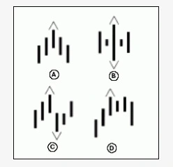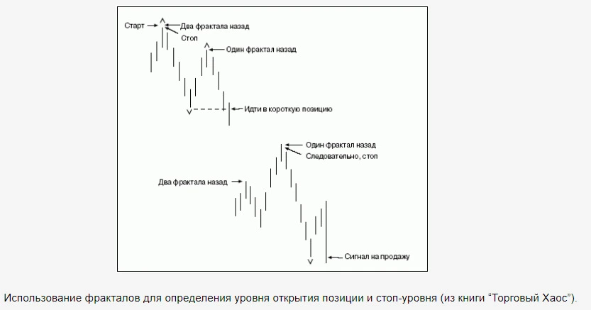 Как следствие, фракталы не могут появиться на самом правом краю графика. Для его образования, нужно, как минимум, 5 баров. Примеры того, какими могут быть фракталы, вы можете увидеть на картинке из книги “Торговый хаос”.