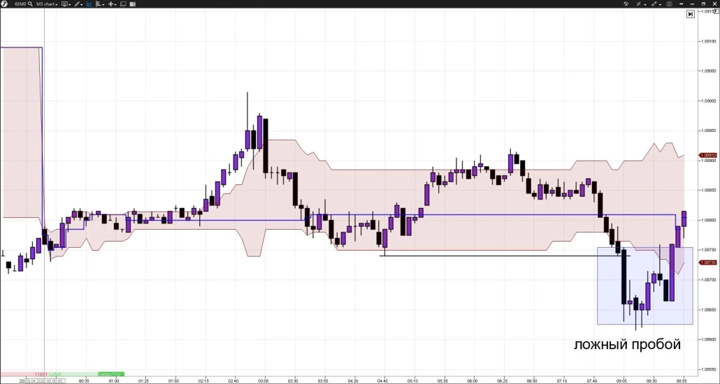 Если на рынке присутствует восходящий тренд, и внутри дня цена пробила нижний фрактал, выйдя из области Value area, а потом в неё вернулась — то, скорее всего, это был ложный пробой, и движение вверх вероятно продолжится.