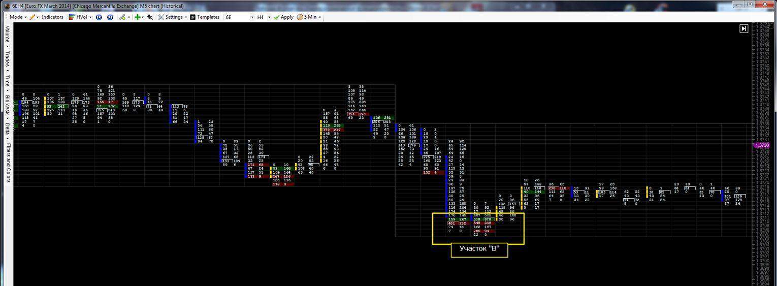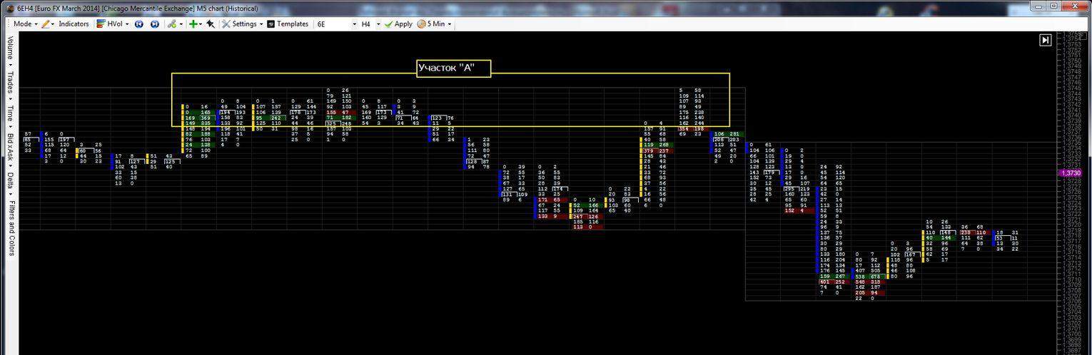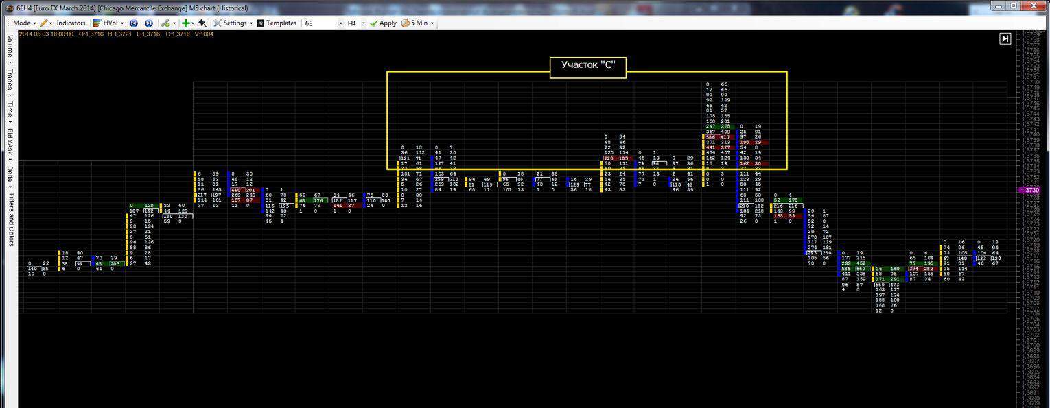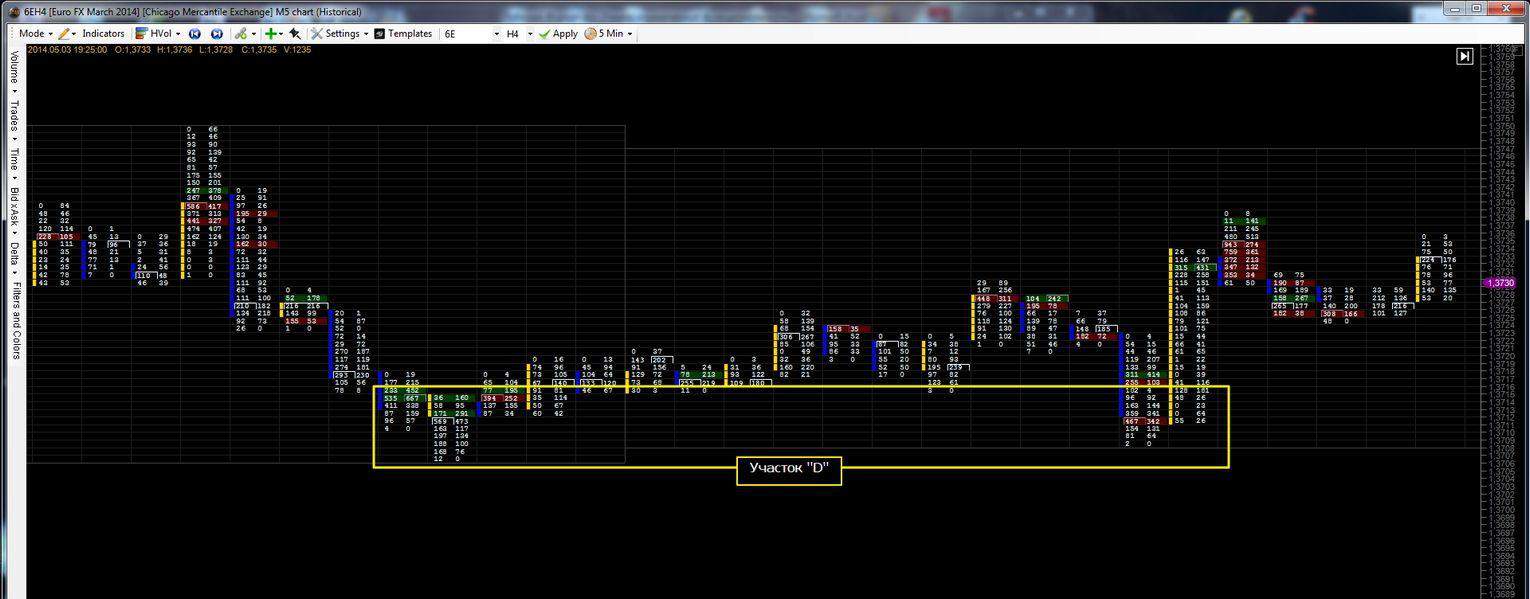 Теперь давайте посмотрим на этот же участок 5ти минутного графика но только в формате футпринт: