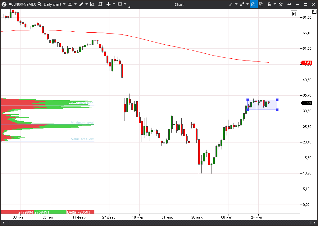 Тем временем, наиболее чувствительные к торговым войнам активы, такие как нефть и валюты сырьевых стран, уже начали реагировать повышенной волатильностью. 26 мая была попытка нефти уйти в коррекцию, но провал быстро выкупили. Шансы на тестирование $42 пока остаются. Ключевая задача сейчас — пробой зоны накопления объемов в районе $31-34 за баррель.