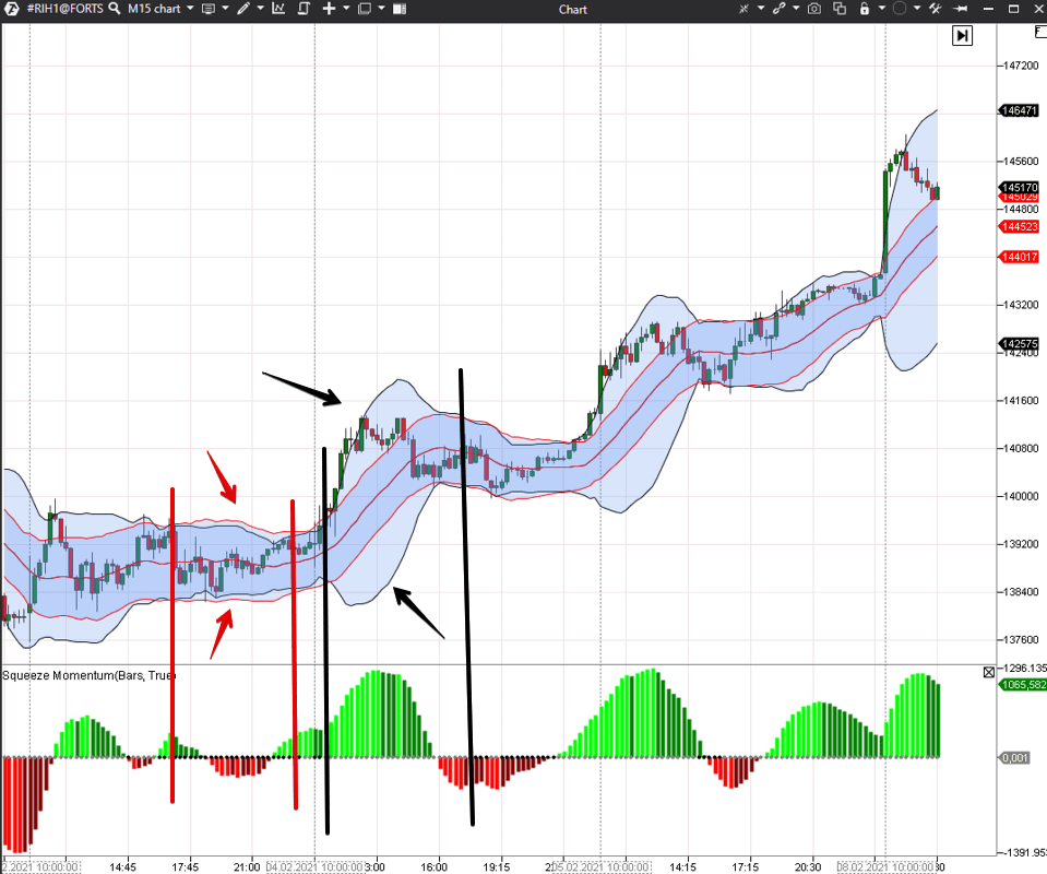 Пример. На 15-минутном графике фьючерса на индекс РТС RIH1 красными вертикальными полосами мы выделили период бокового движения цены. В это время полосы Боллинджера находятся внутри канала Кельтнера, а на индикаторе – черные точки.