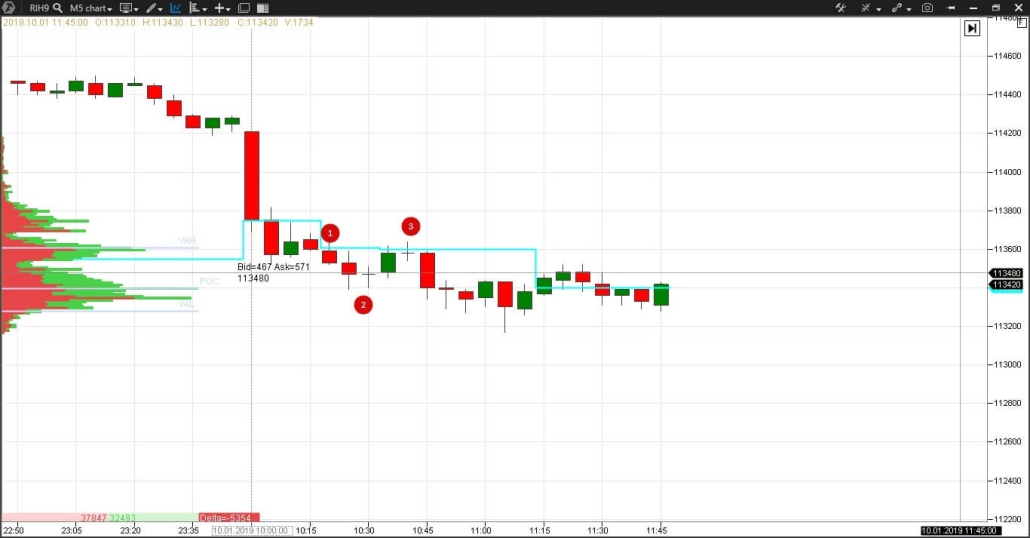 3 — В 10:40 иссякание покупок на хае доджи сразу после имбаланса покупателей предупреждает о том, что цену не удалось протолкнуть вверх.