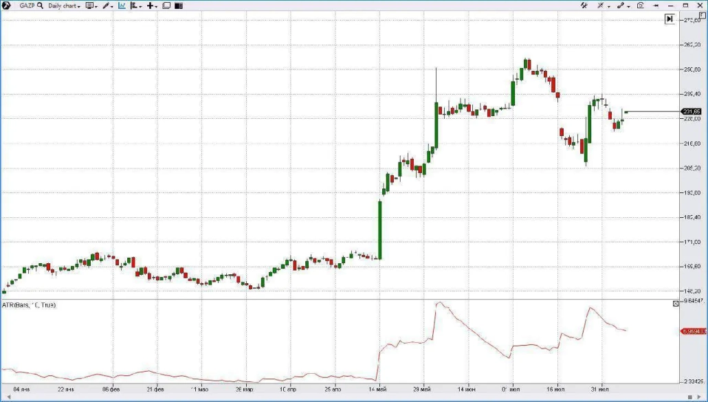 ATR измеряет текущую волатильность рынка (что такое волатильность). На картинке ниже показан график акции GAZP. В левой части — рынок относительно не волатильный, справа — волатильность возрастает.